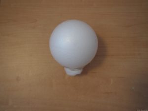 まずは、発泡スチロールで頭部を作ります。パペット人形なので、手を入れて操作できるように、球型の発泡スチロールに細工をしていきます。