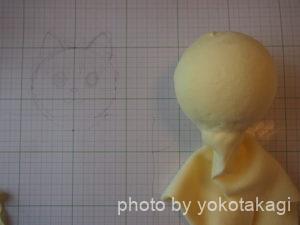 今回の猫人形は、黄色の猫、です。柔らかくてよく伸びるソフト布で、頭部を覆っていきます。顔の部分にシワが出ないよう、布を伸ばしながら木工用ボンドで貼っていく作業です。